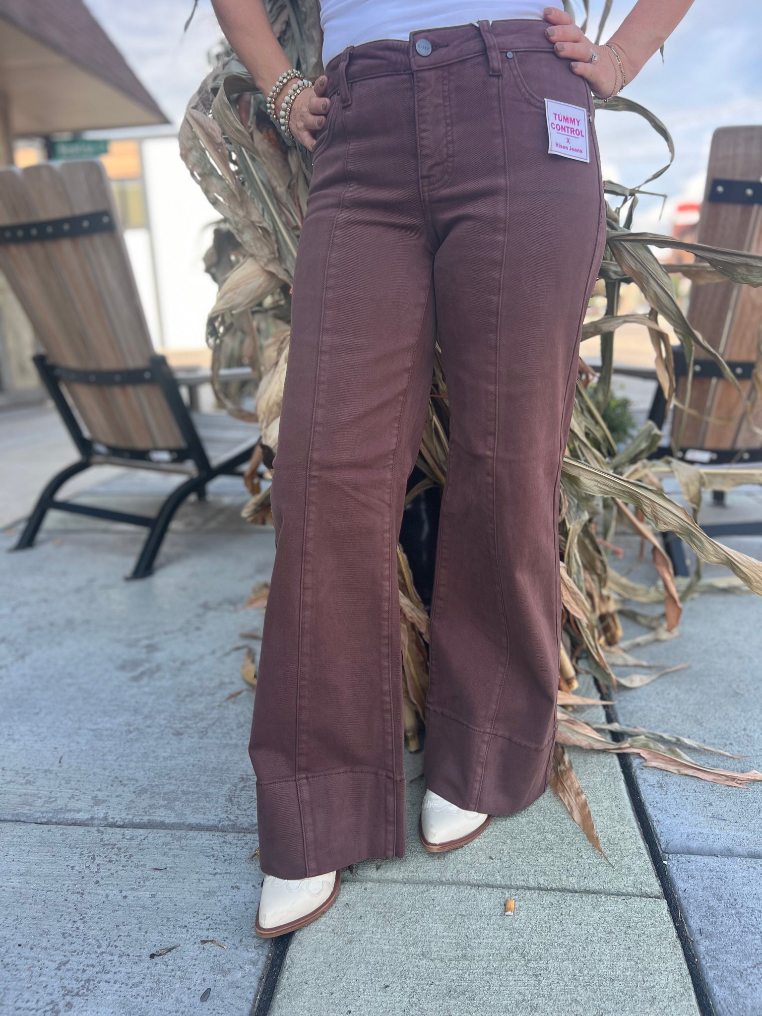 Risen Mid RiseTummy ControlMid RiseWide LegFront SeamColoredStretchy MaterialNo DistressingStandard Sizing: Rise 9.5" | Inseam 31 3/4" in Size 3/26Material: 98% Cotton, 2% SpandexModel is Wearing Size: 3/26Product Care: Turn Inside Out, Machine Wash Cold, Tumble Dry Low, Gentle Cycle with Like Colors, Do NOT Bleach, Hang to Dry, Iron If NeededModel Measurements: Height 5'3"