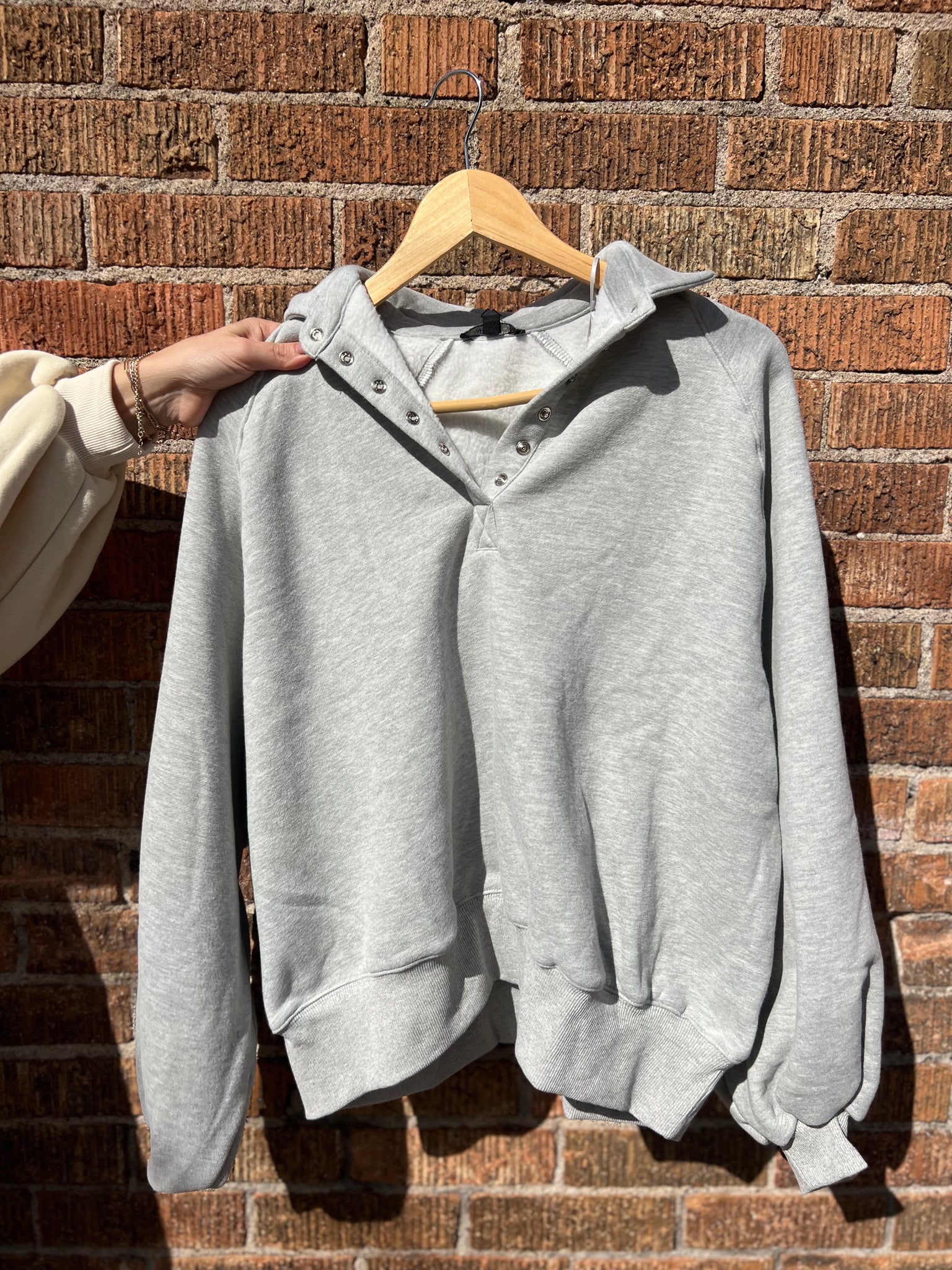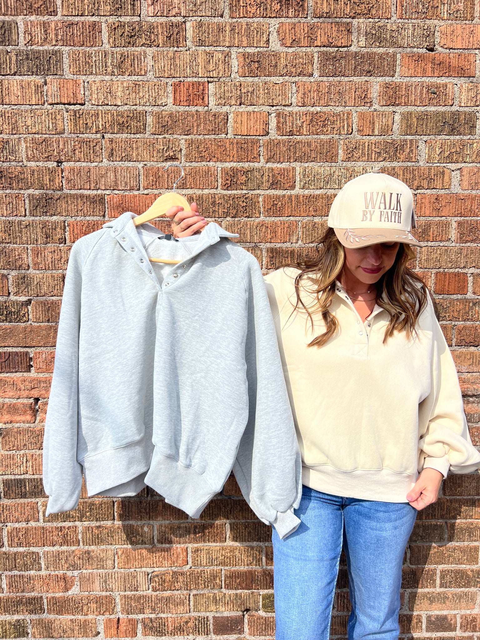 Cozy Pullover Washed Effect Relaxed Fit Snap Buttons Dolman Sleeves Drop Shoulder Material: 52% Polyester, 48% Cotton, Model is Wearing a Size: Model Measurements: 5’ 3”