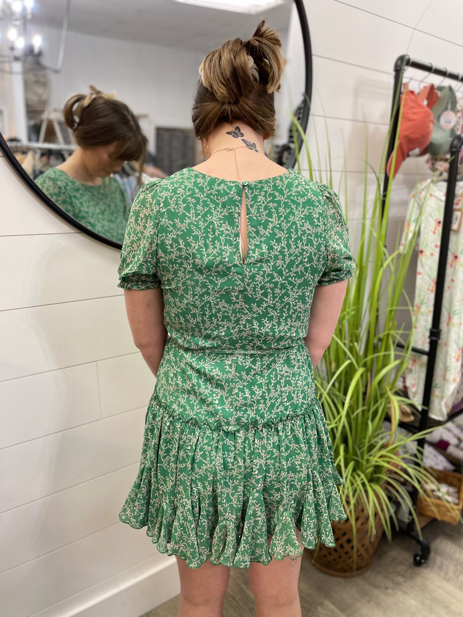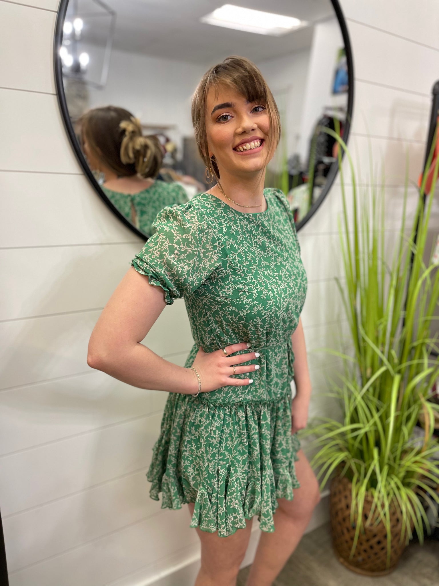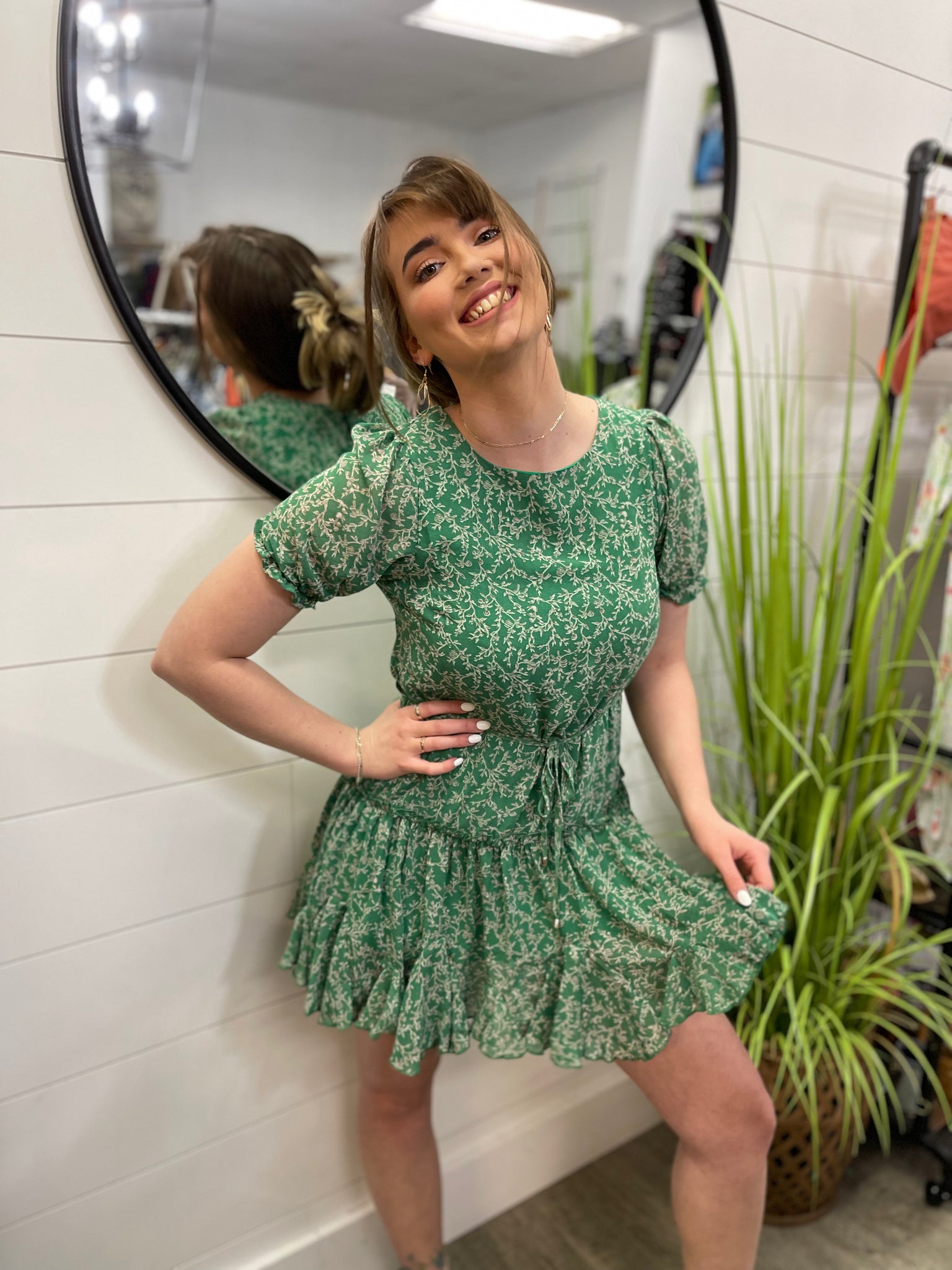 Patterned Mini Dress, Short Sinched Sleeves, Ruffled Bottom