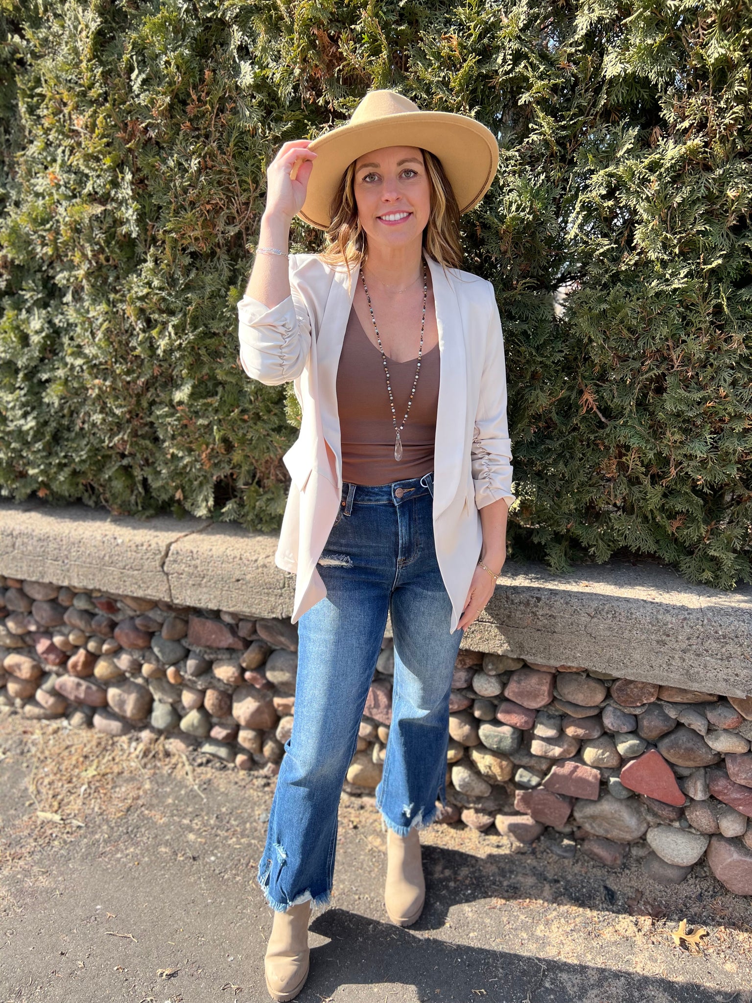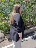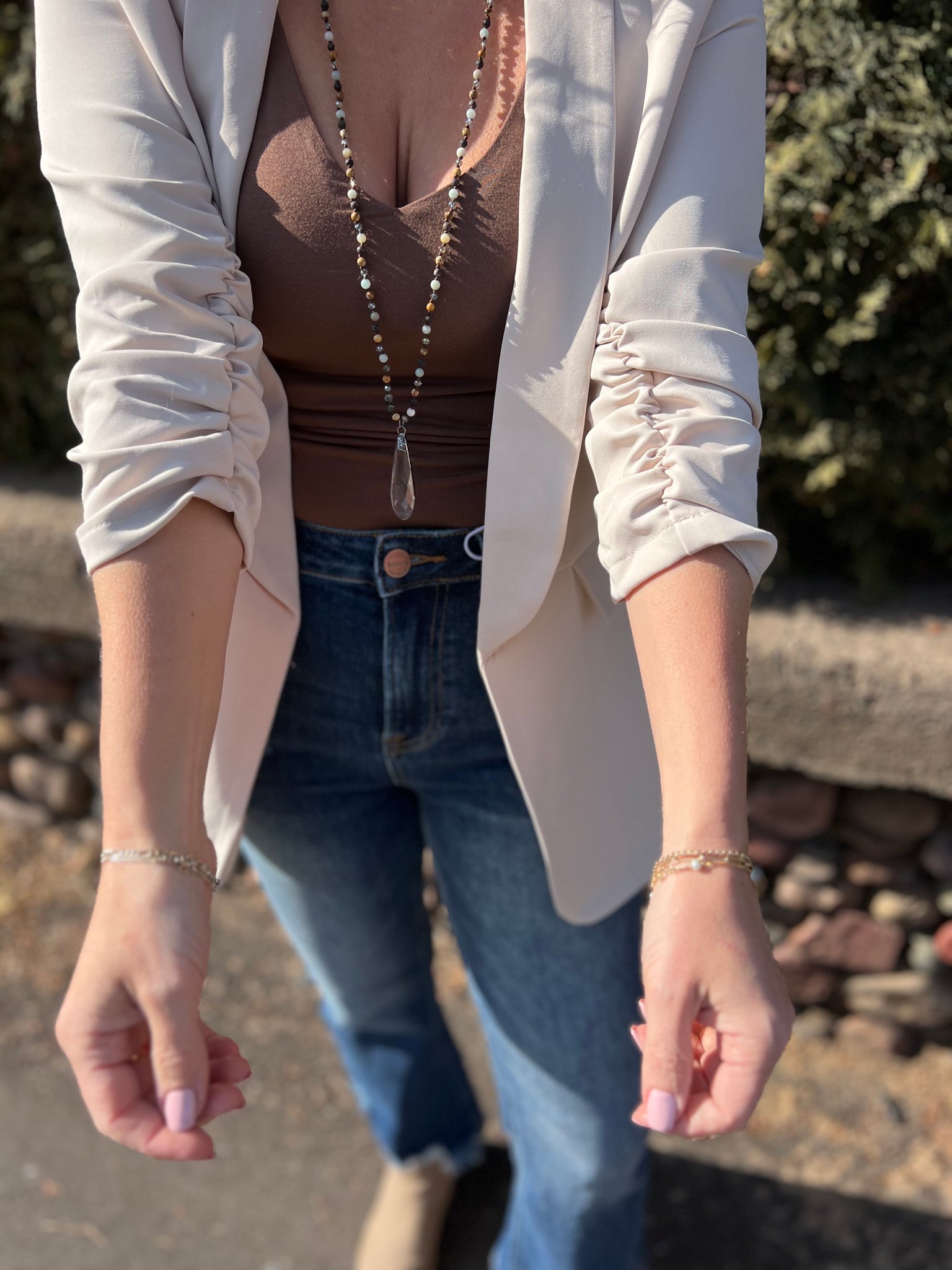 Shawl collar, Open front, 3/4 ruched sleeves, Not lined
