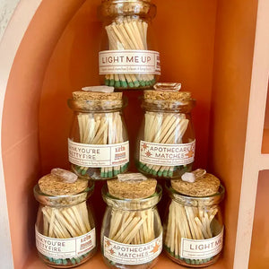 Colored tip matches in an apothecary-inspired glass jar with a cork top + a striker on the bottom.