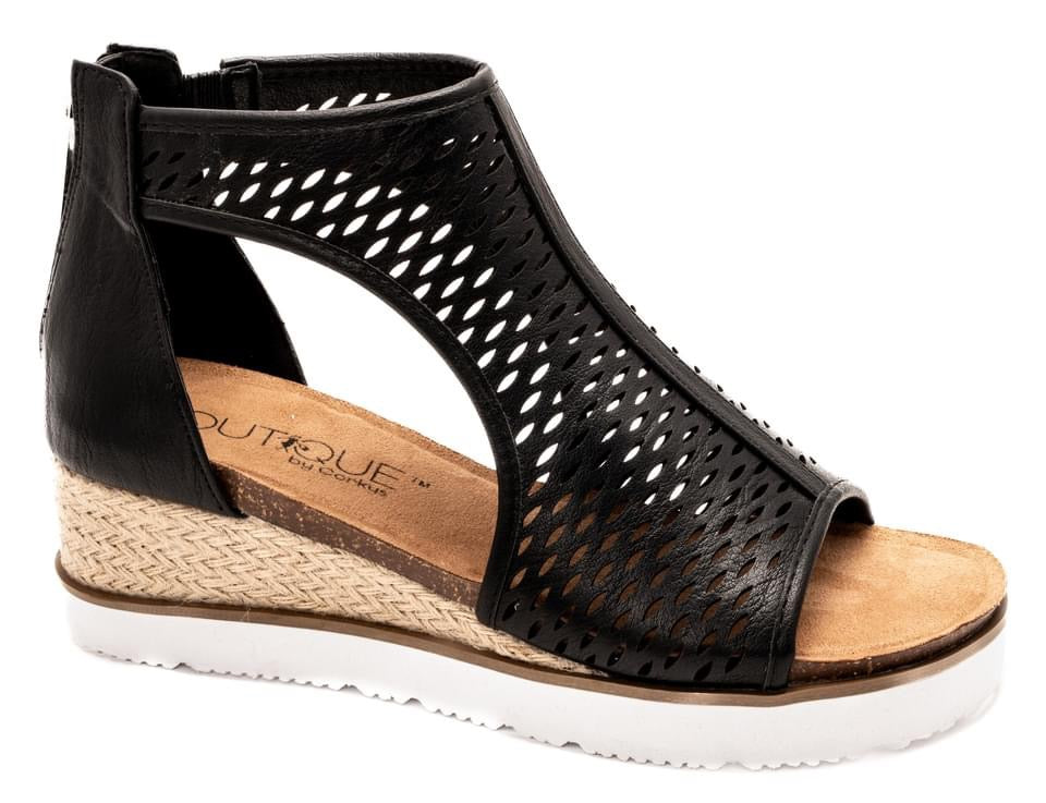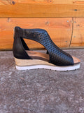 Sugar Mama -synthetic upper, back zip entry, jute wrapped wedge, rubber outsole,