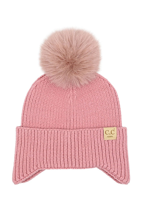 Kid's Ear Flap Solid Beanie with Pom Pom - Solid Colored Beanie with Ear Flaps - Cuff Style Solid Colored Beanie - 48% Viscose, 25% Polyester, 27% Nylon -100% Faux Fur Pom Pom Attached **One Size Fits Most (7.75" W x 7" H)** **Ear Flap 1.25" Long**
