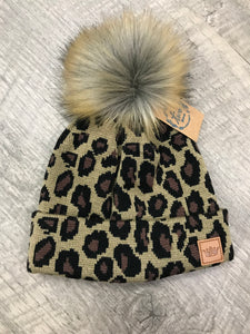 Kids Leopard Knit Hat W/ Pom-Pom