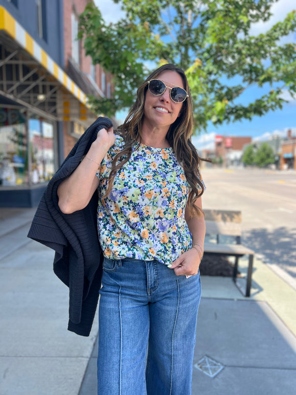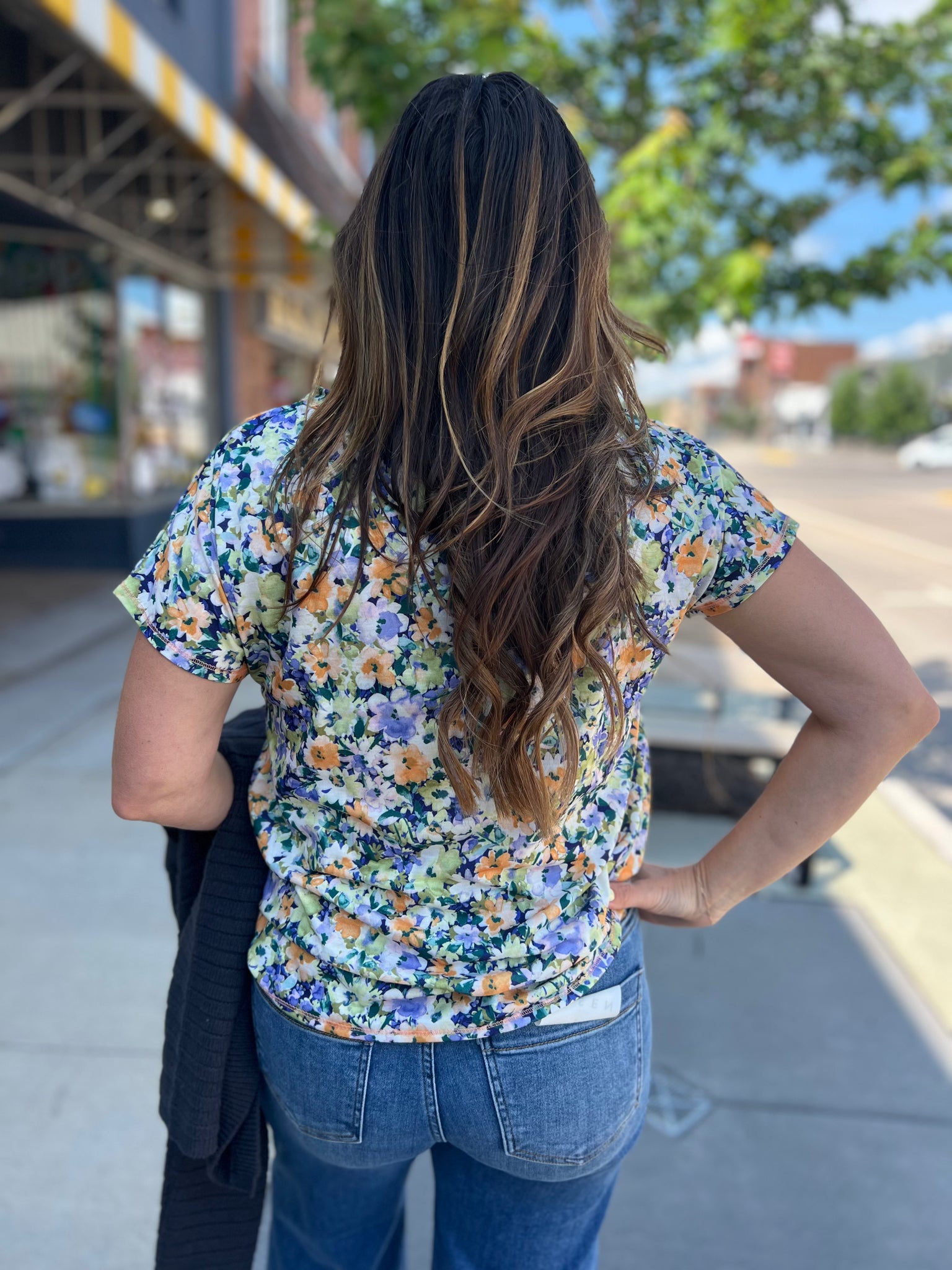 Brighten up your everyday look with this Pastel Floral Print Relaxed Tee. Featuring a charming mix of peach, lavender, mint, and navy blooms on a soft, lightweight fabric, this top offers a breezy fit with short sleeves and a classic crew neckline. Perfect for pairing with cardigans, this tee adds a cheerful pop of color and effortless style to your casual wardrobe.