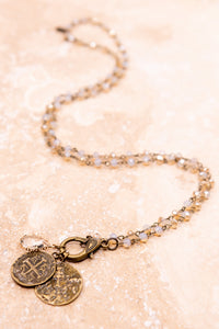 This long necklace has cream crystal beads connected by chain links. The bottom has a big, detail lobster claw that includes 2 doubloon coins and a teardrop crystal.