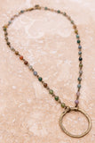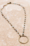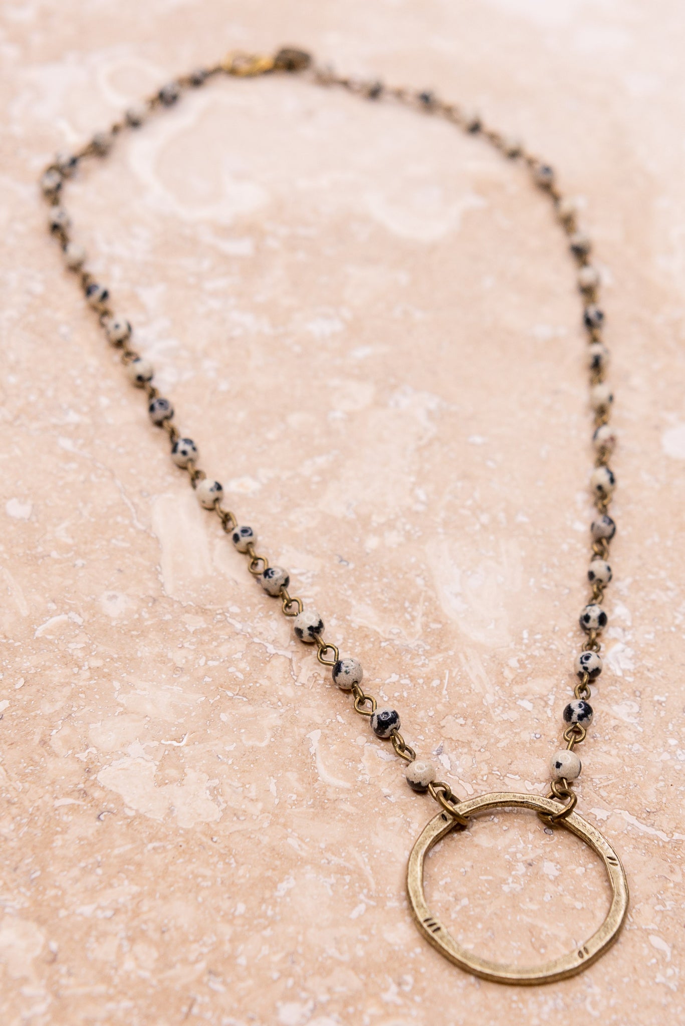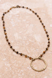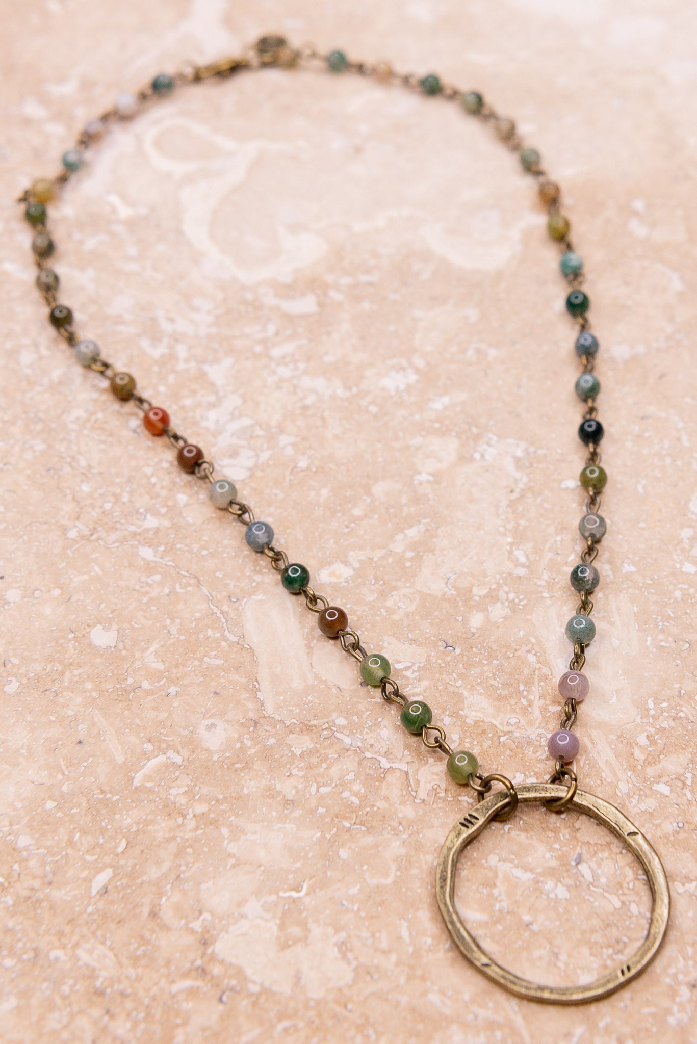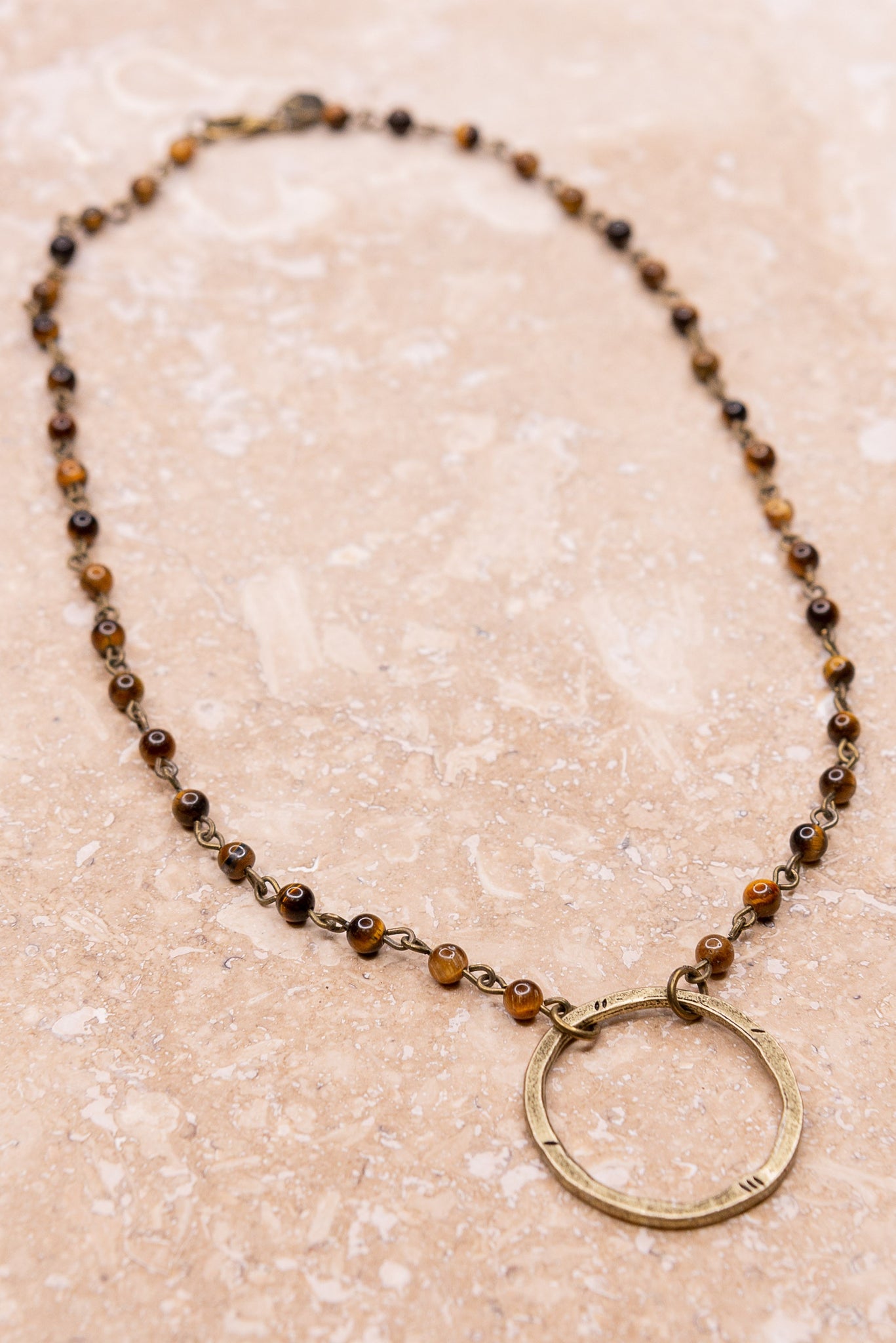 Short, skinny chain link necklace with natural stone beads and bronze ring. Lobster claw closure. Due to natural materials, color/texture may vary. Measurements done when necklace is closed. Chain: 8.5" Ring Diameter: 1.25"