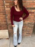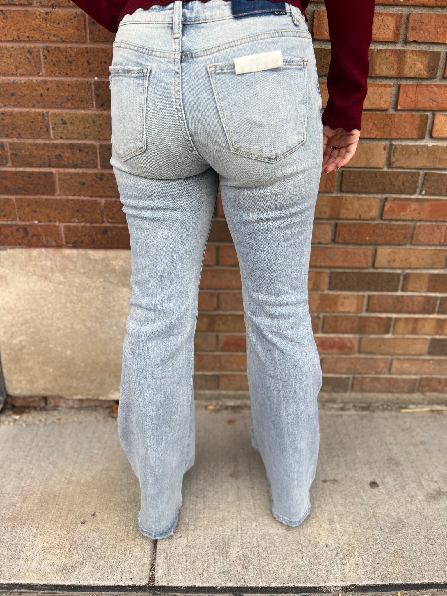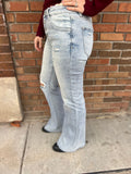 Risen Mid Rise Button Fly FlareLight WashStretchy MaterialDistressingLongStandard Sizing: Rise 9.5" | Inseam 33 in Size 3/26Curvy: Rise 12" | Inseam 27" in Size 1XLMaterial: 91% Cotton, 6% Polyester, 3% SpandexModel is Wearing Size: 3/26Product Care: Turn Inside Out, Machine Wash Cold, Tumble Dry Low, Gentle Cycle with Like Colors, Do NOT Bleach, Hang to Dry, Iron If NeededModel Measurements: Height - 5’ 3”