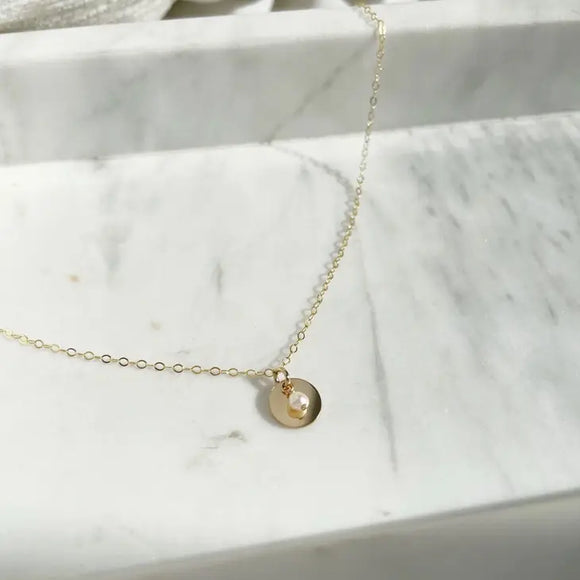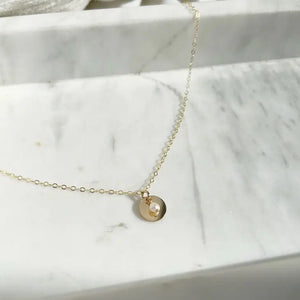 This necklace is a favorite for everyday wear and makes the perfect gift. A delicate brushed disk and tiny gemstone hang from a beautiful chain. DETAILS The chain is available in 16" or 18" with an additional 1" adjustable closure. The disk is 7mm in diameter. Available gemstones: Labradorite, peach moonstone, aquamarine, moonstone, lapis (blue), white pearl, turquoise Token Jewelry's minimal and modern jewelry line includes earrings, necklaces, bracelets and rings-each handmade to order at our studio in Eau Claire, WI using semi precious gemstones, 14k gold fill, rose gold fill and sterling silver. Please allow for natural variations that may occur.