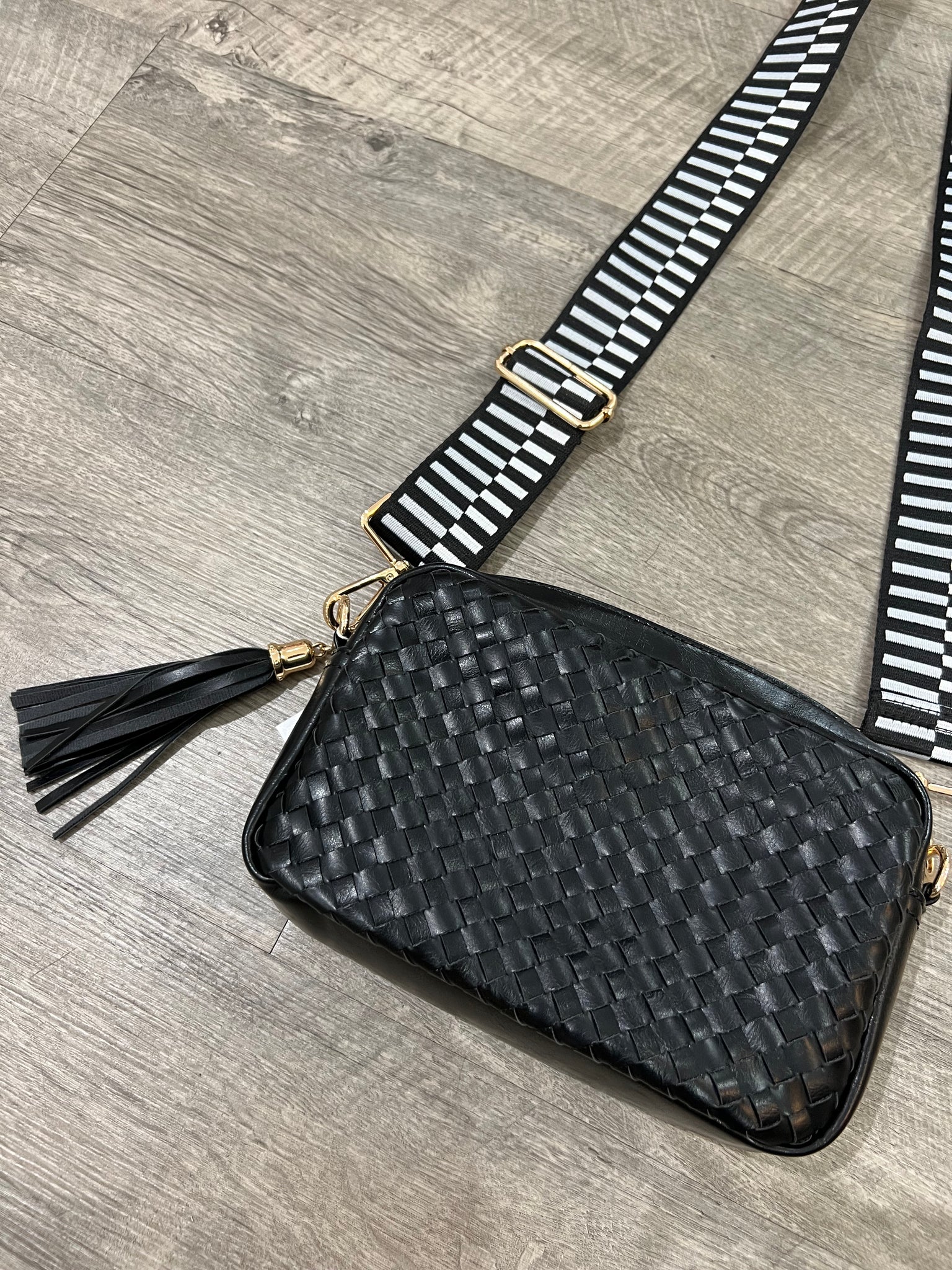 this vegan leather bag has fun straps with a block design.